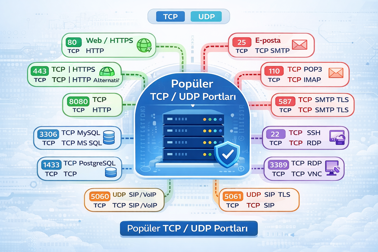 Port Protokol Hizmet / Kullanım 20 TCP FTP (Veri Aktarımı) 21 TCP FTP (Kontrol) 22 TCP SSH (Secure Shell) 23 TCP Telnet 25 TCP SMTP (E-posta Gönderimi) 53 UDP/TCP DNS (Alan Adı Çözümleme) 67 UDP DHCP ...
